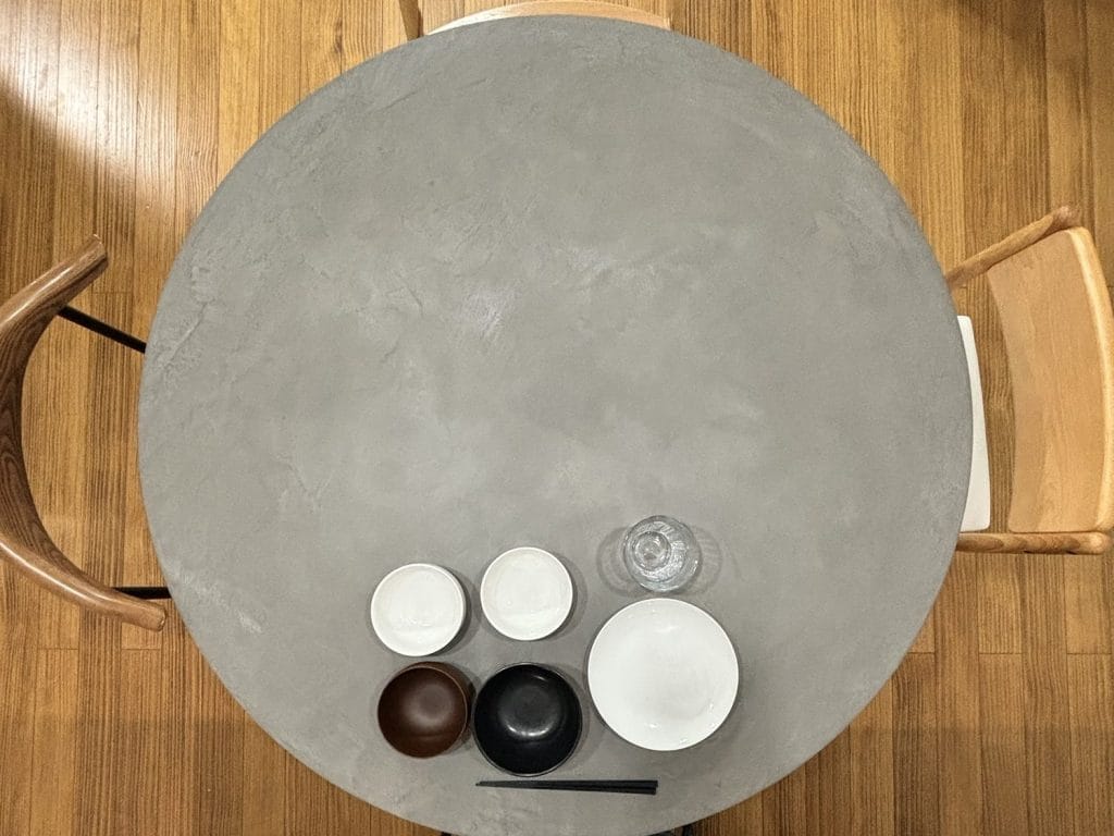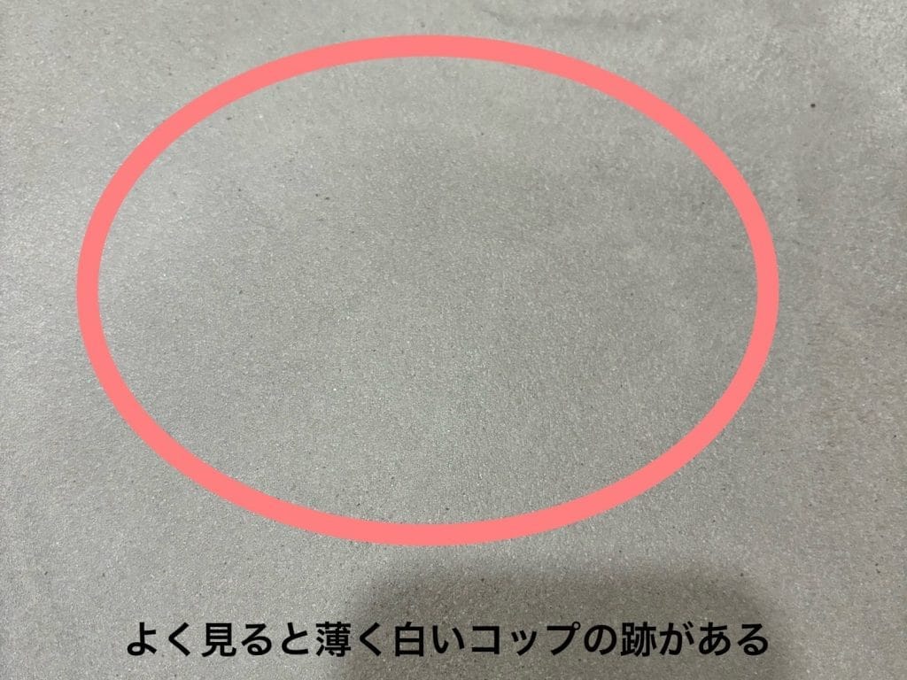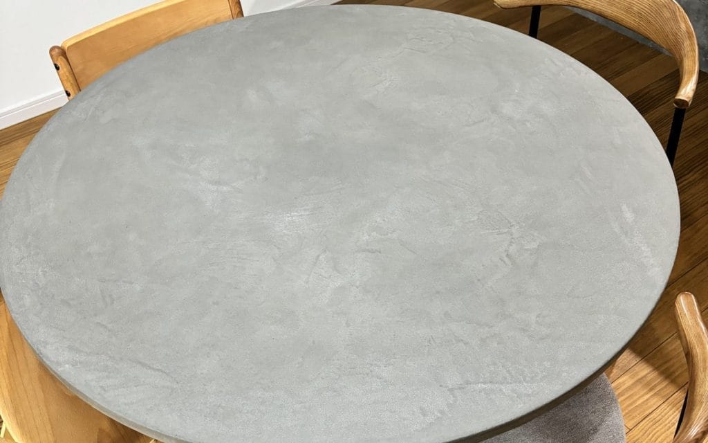 左官材ならではの独特な風合いが魅力。水や汚れに比較的強いと言われますが、コーヒーなどの濃いシミはつくことがあります(我が家も経験済み!でも、お手入れで薄くなることも)。また、表面に微妙な凹凸があるので、下敷きなしでの書き物は苦手です。